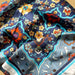 Beautiful silky soft flowing polyester. Absolutely stunning Neck Scarf of exceptional quality, in a timeless rustic and whimsical pattern. A pretty, multicolour scheme with a navy background and a bright blue and white border.