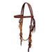Premium quality USA 3/4" leather bridle with stainless steel cartwheel buckles and slotted conchos with blood knots. Curved and shape cheek pieces give the bridle a unique look.